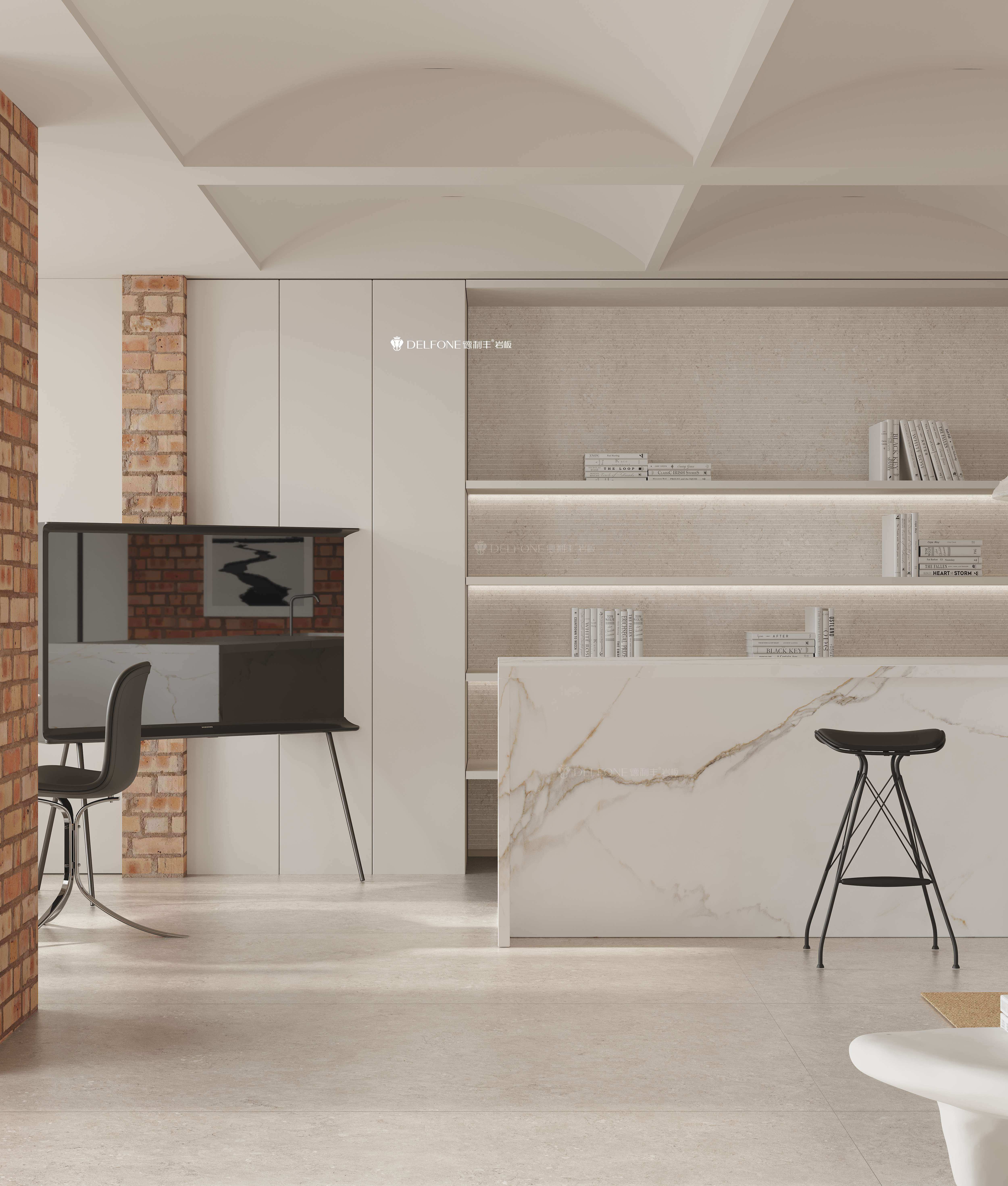 源自英国:重构墙面侘寂美学 灵感源自波特兰的数百年水泥风建筑——那些在时间、风雨与人文洗礼下,形成的独特微观肌理。这种从粗犷工业感到静谧侘寂风的自然过渡,正是当代人所追寻的“松弛感美学”的核心。 我们摒弃对自然肌理的过度修饰,通过高精度数码扫描技术,完整捕捉波特兰混凝土的原生肌理细节,再借助先进的数码模具工艺,精准复刻于性能卓越的岩板之上。从“波特兰米白”的纯净温润到“波特兰米黄”的温暖醇厚,每一款颜色都延续了自然材质的本真质感,让墙面不再是单调的装饰,而是能与空间共鸣的时光载体。